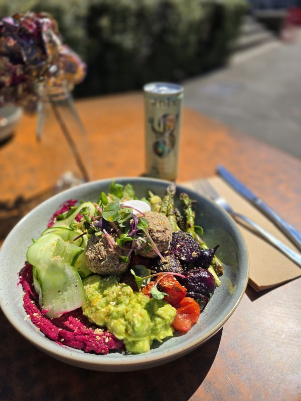 Kumura falafels on a brown rice/quinoa salad with roasted beets, blistered cherry tomatoes, avo, cucumber and hummus $26.00